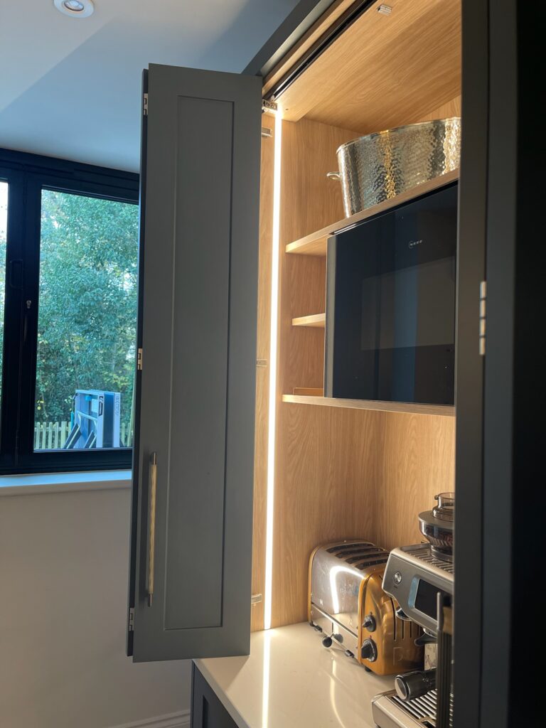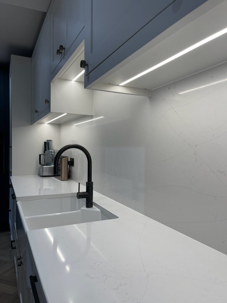 Task Lighting: The most practical layer — lighting that allows you to see clearly when preparing food or cooking. Think under-cabinet LED strips, recessed downlights, or spotlights above key work areas like the hob and sink.